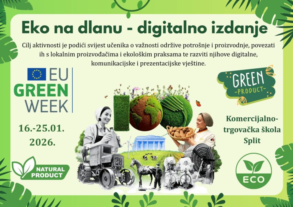 International Green Week, od 16. do 23. siječnja 2026. godine obilježili su i učenici 3.a razreda Komercijalno-trgovačke škole Split, pod mentorstvom nastavnice Marije Istenić, zanimljivom aktivnošću „Eko na dlanu“ usmjerenoj na promicanje održivog razvoja, odgovorne potrošnje i aktivnog građanstva. Aktivnost je provedena u okviru međupredmetnih tema Održivi razvoj, Građanski odgoj i obrazovanje te Uporaba informacijske i komunikacijske tehnologije.