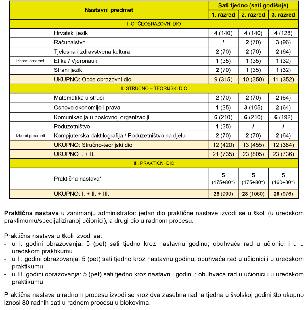 Trogodišnji obrazovni program usmjeren na stjecanje praktičnih i stručnih znanja potrebnih za obavljanje administrativnih poslova. Učenici kroz nastavu i stručnu praksu uče organizaciju uredskog poslovanja te jedan strani jezik.