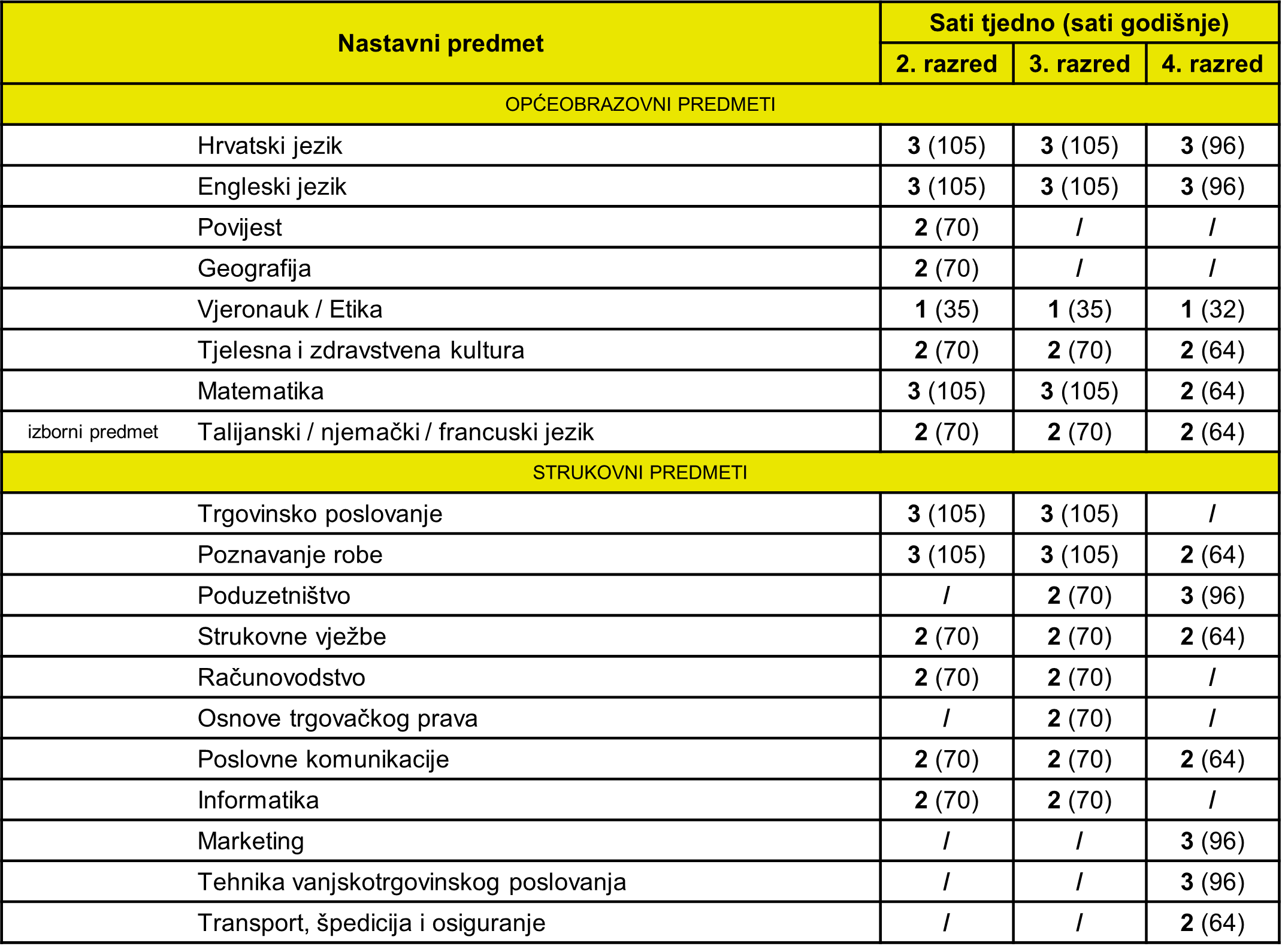 Četverogodišnji obrazovni program koji priprema učenike za rad u području trgovine, marketinga i poslovne komunikacije. Kroz nastavu stječu znanja iz općih i stručnih predmeta, a nakon završetka imaju mogućnost nastavka školovanja na visokim učilištima.