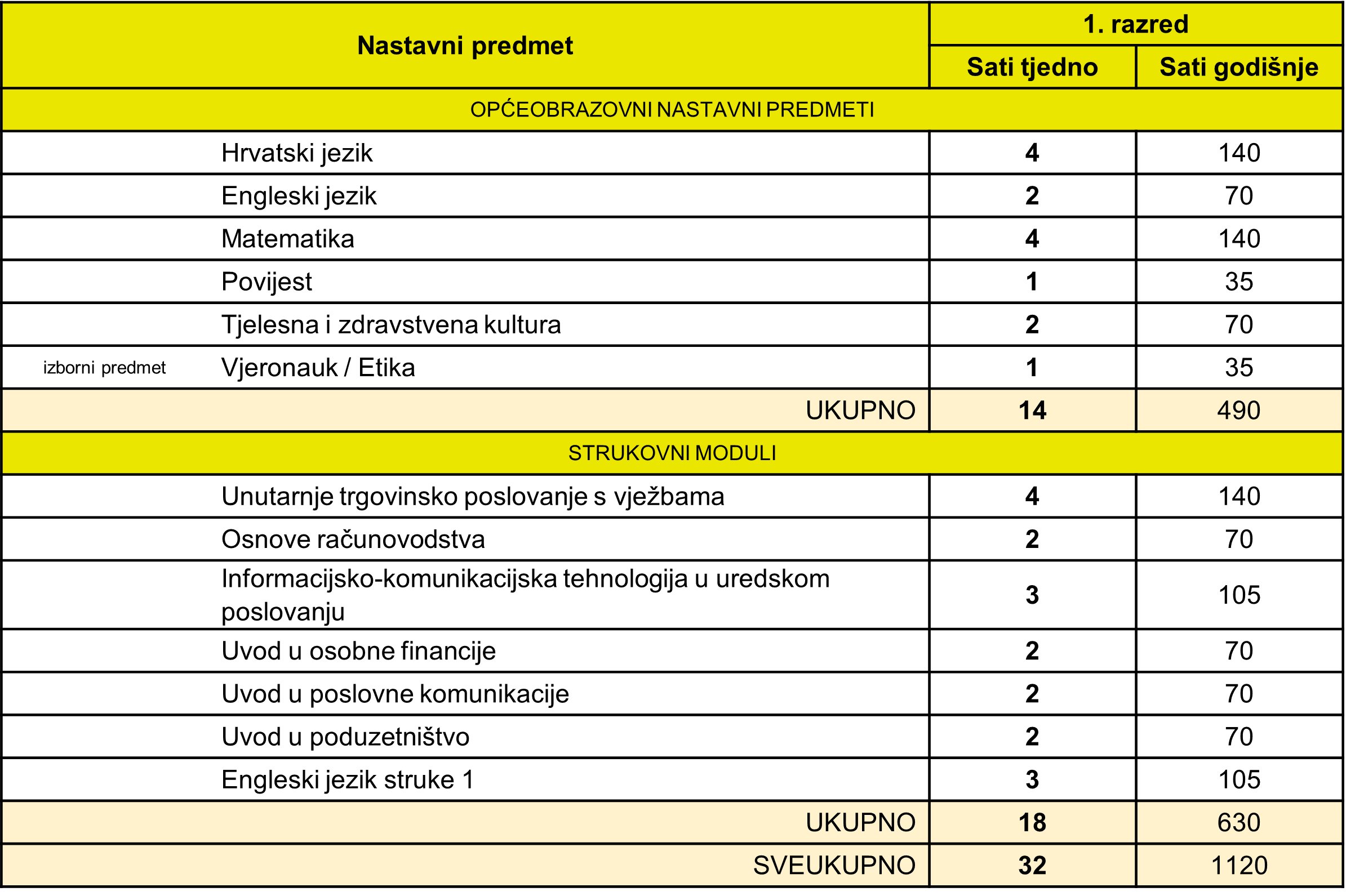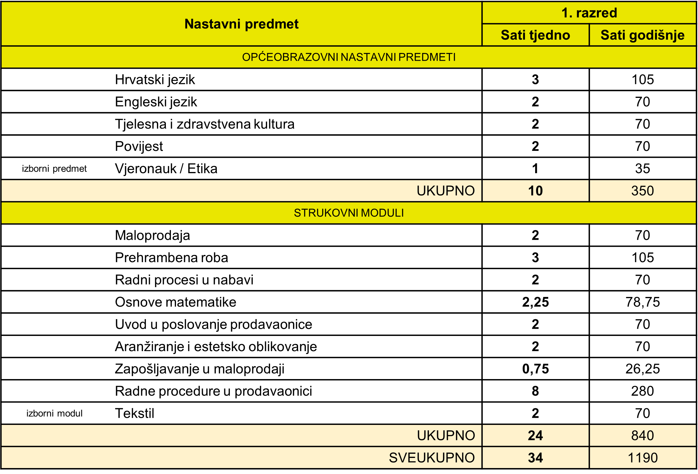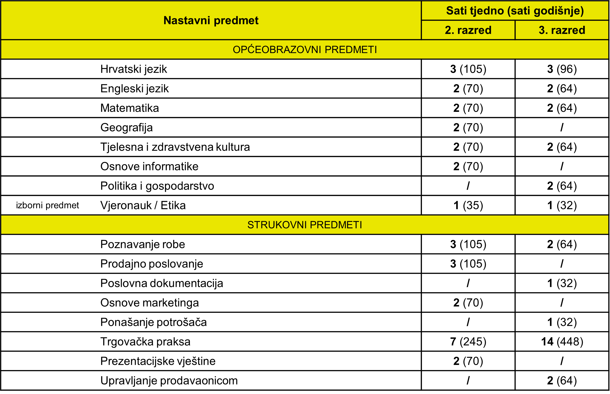 Trogodišnji program u kojem se kombinira teorijska i praktična nastava. Učenici stječu znanja i vještine potrebne za rad u trgovini, uz jedan strani jezik i ljetnu stručnu praksu, a kasnije mogu nastaviti obrazovanje kroz programe za odrasle.
