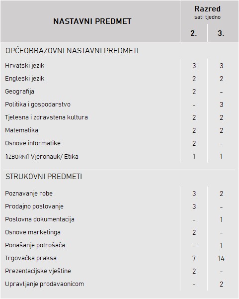 Trogodišnji program u kojem se kombinira teorijska i praktična nastava. Učenici stječu znanja i vještine potrebne za rad u trgovini, uz jedan strani jezik i stručnu praksu, a kasnije mogu nastaviti obrazovanje kroz programe za odrasle.