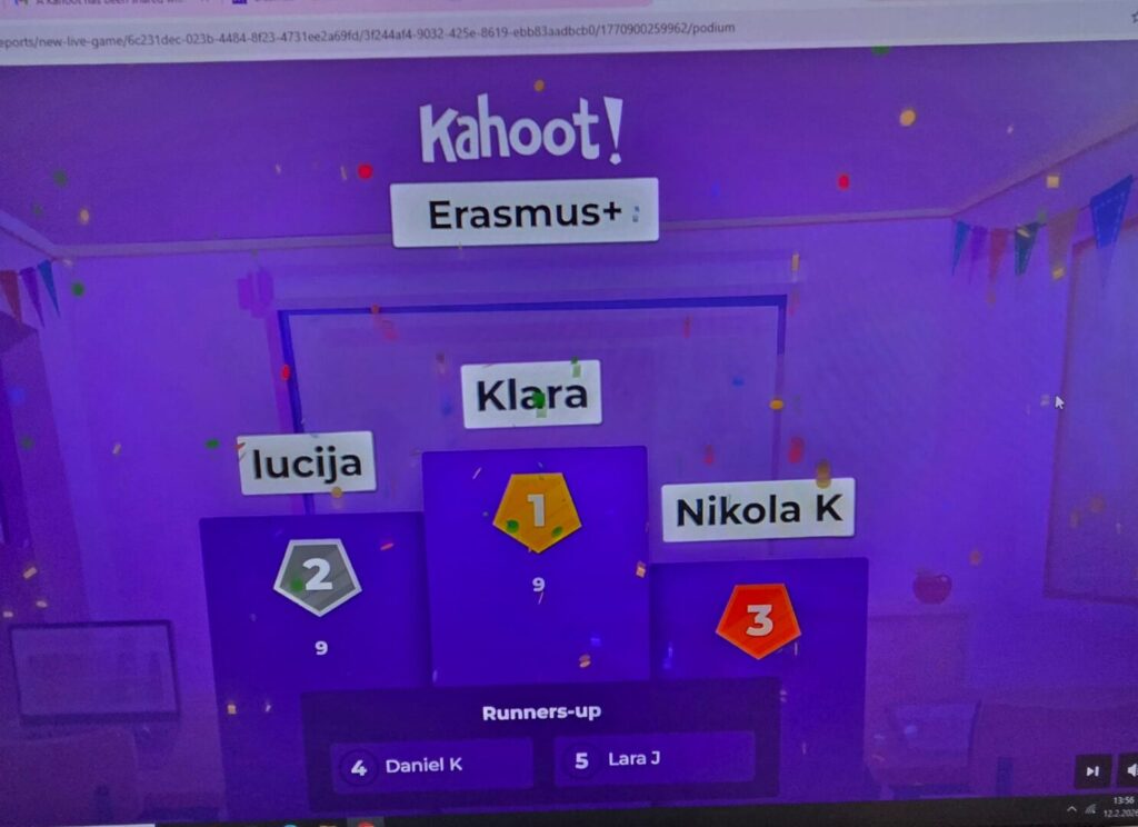 Završni dio predavanja bio je posvećen interaktivnom Erasmus+ Kahoot kvizu, kao motivacijskom i edukativnom alatu za provjeru razumijevanja programa. Najuspješnija učenica ostvarila je dodatne bodove u postupku bodovanja za mobilnost, u skladu s objavljenim kriterijima.