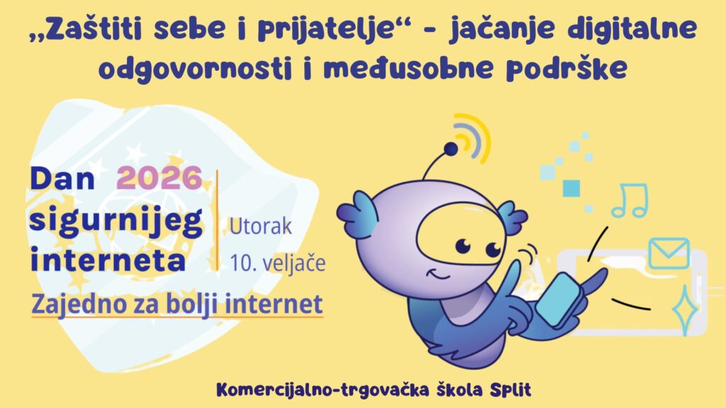 Povodom obilježavanja Dana sigurnijeg interneta, 10. veljače 2026. nastavnica Marija Istenić, prof. savjetnica, s učenicima 4.c razreda Komercijalno-trgovačke škole Split održala je edukativnu i interaktivnu radionicu „Zaštiti sebe i prijatelje“. Cilj radionice bio je jačanje svijesti o sigurnom i odgovornom ponašanju u digitalnom okruženju te isticanje važnosti traženja pomoći u rizičnim situacijama na internetu.